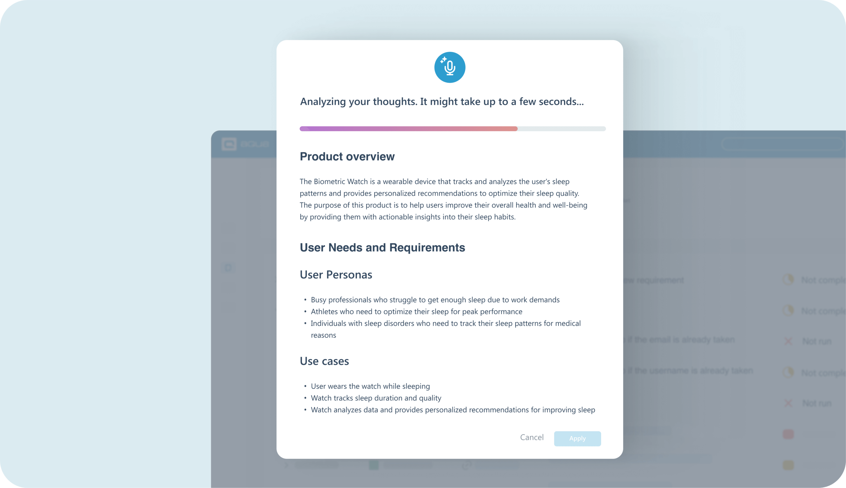 Erläutern Sie mit Ihrer Stimme, was Sie brauchen — und der aqua Narrator bereitet eine komplette Anforderung vor. Wenn Sie mehr Details oder einen größeren Umfang benötigen, können Sie die Ausgabe mit benutzerdefinierten Eingabeaufforderungen optimieren. Das Beschreiben von User Stories muss nicht langweilig sein